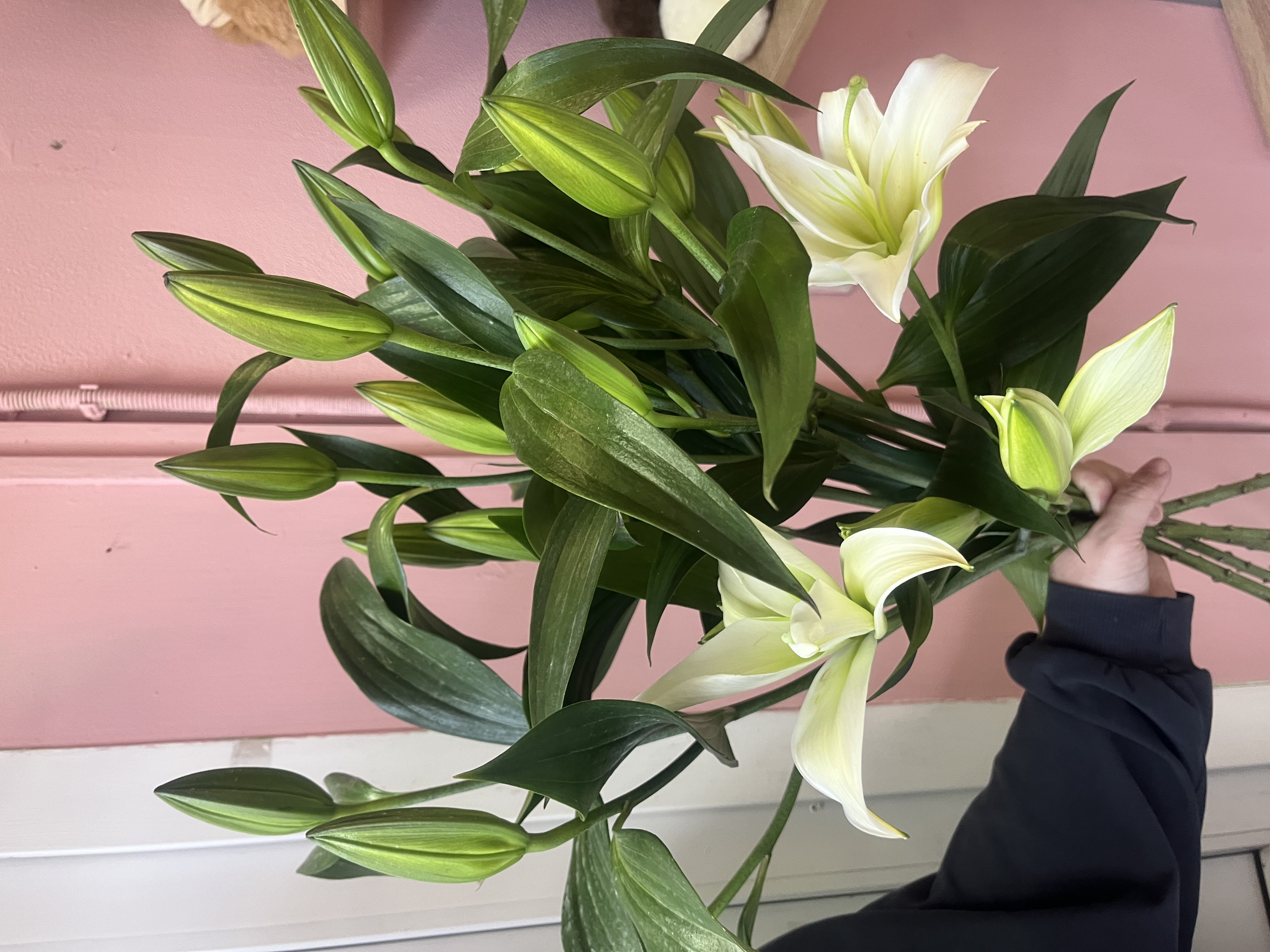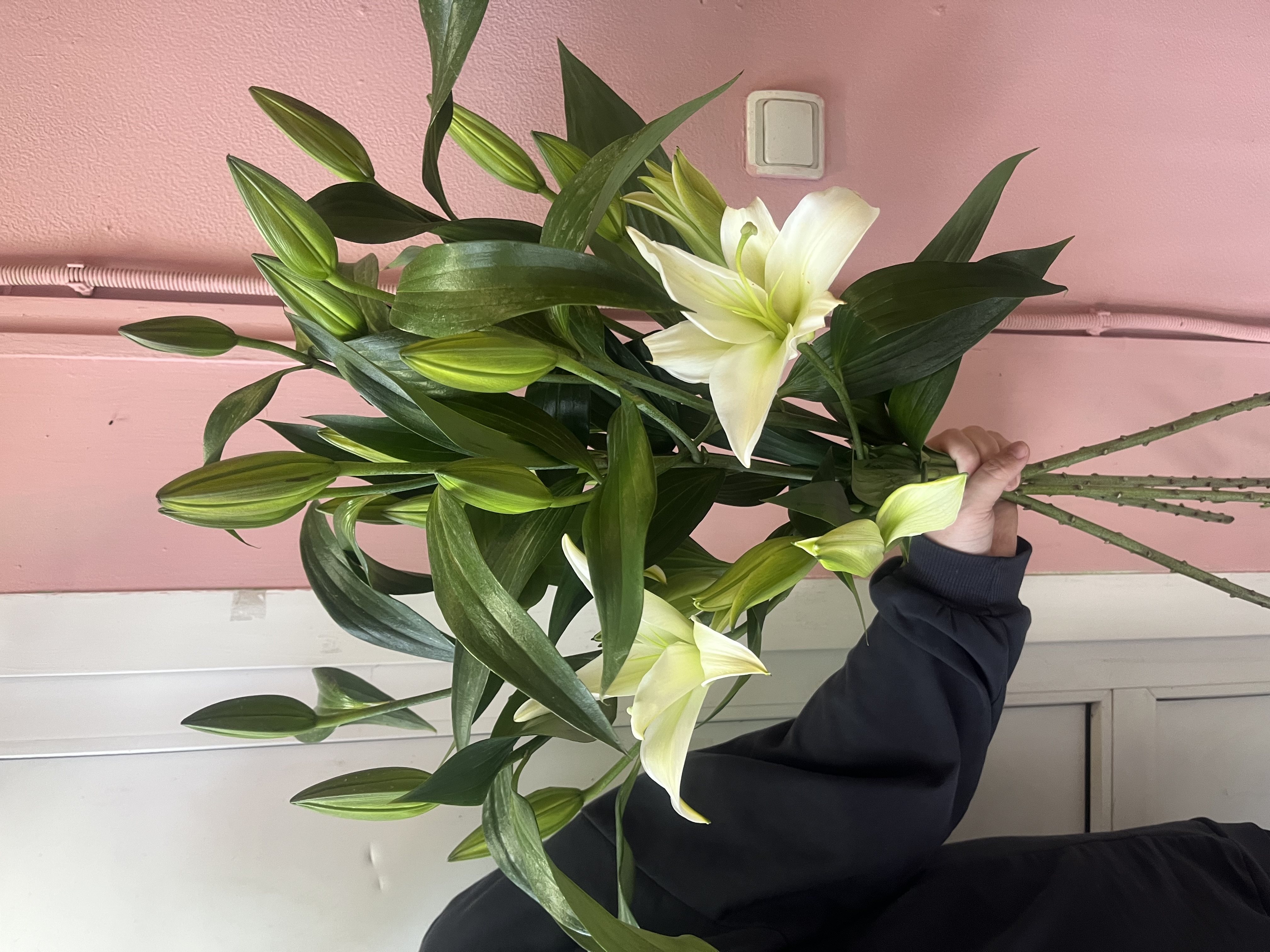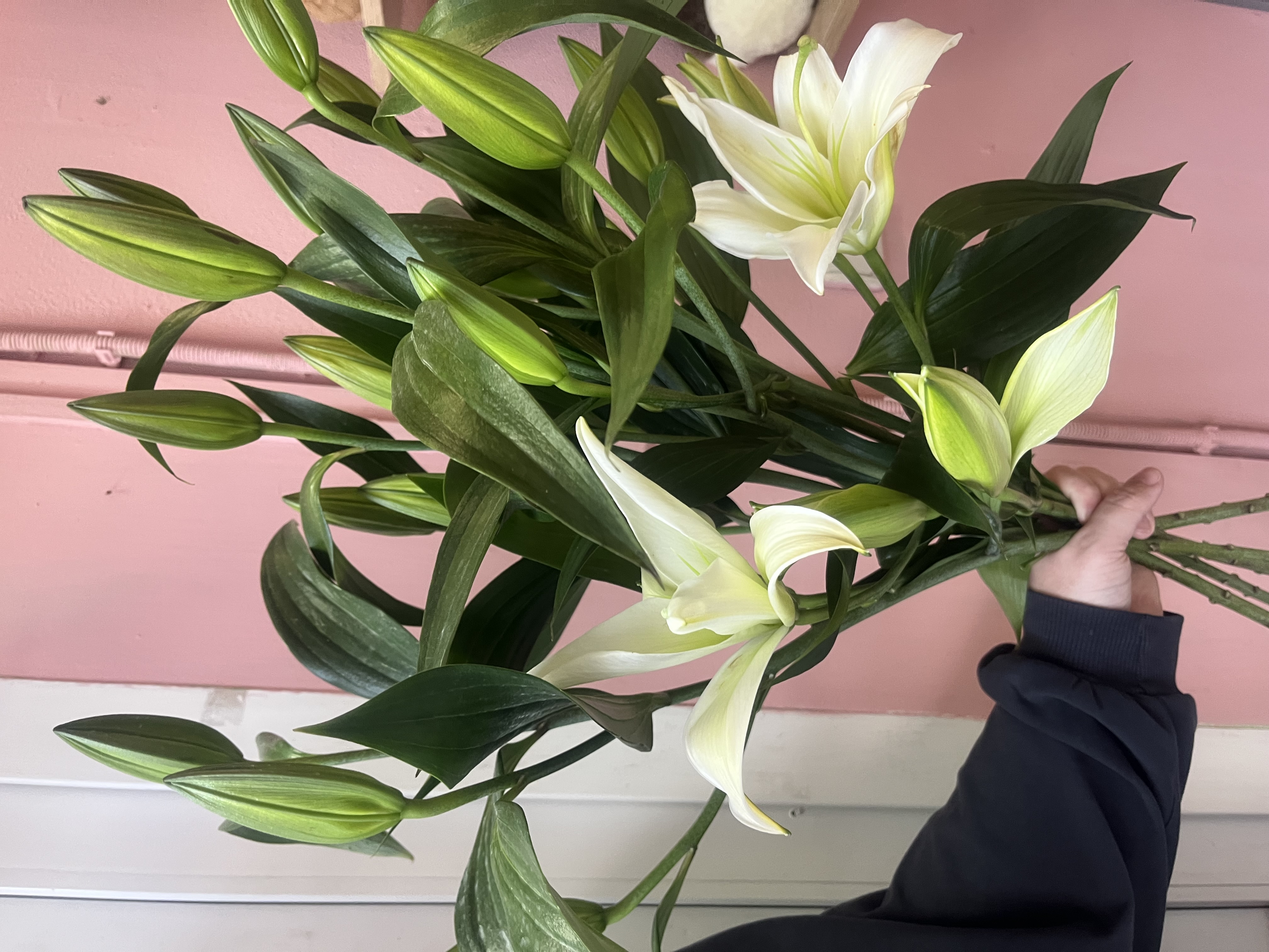 Элегантная композиция из белоснежных лилий с плотными нераскрывшимися бутонами. Длинные стебли и выразительная зелёная листва создают вертикальный, стройный силуэт.