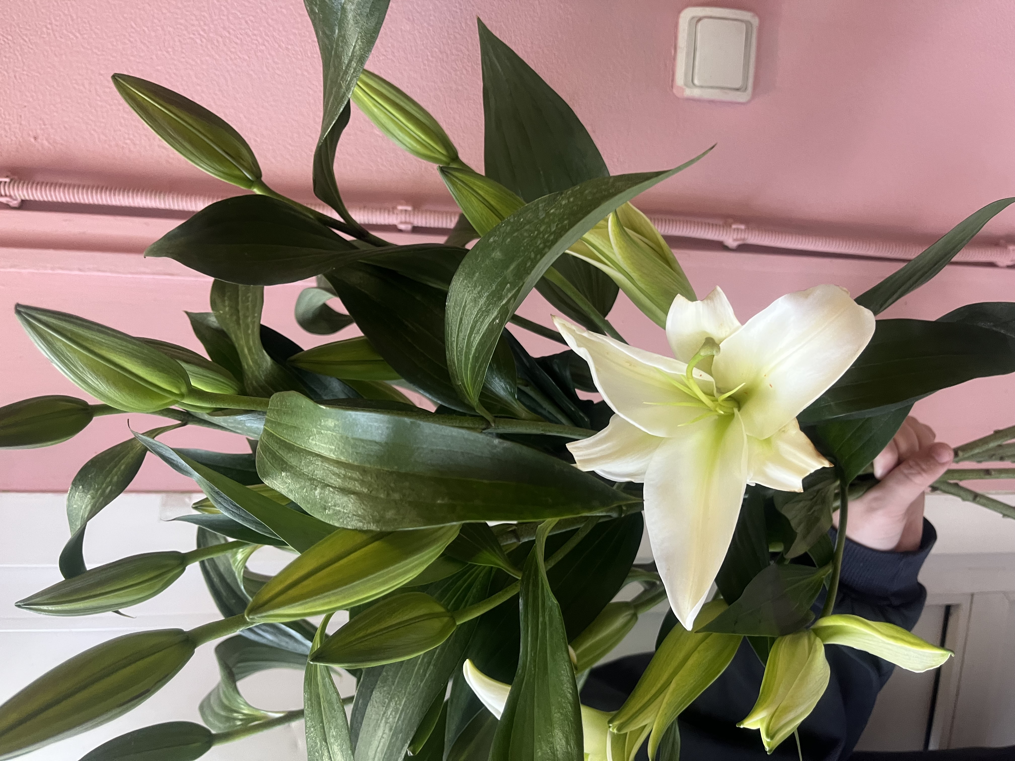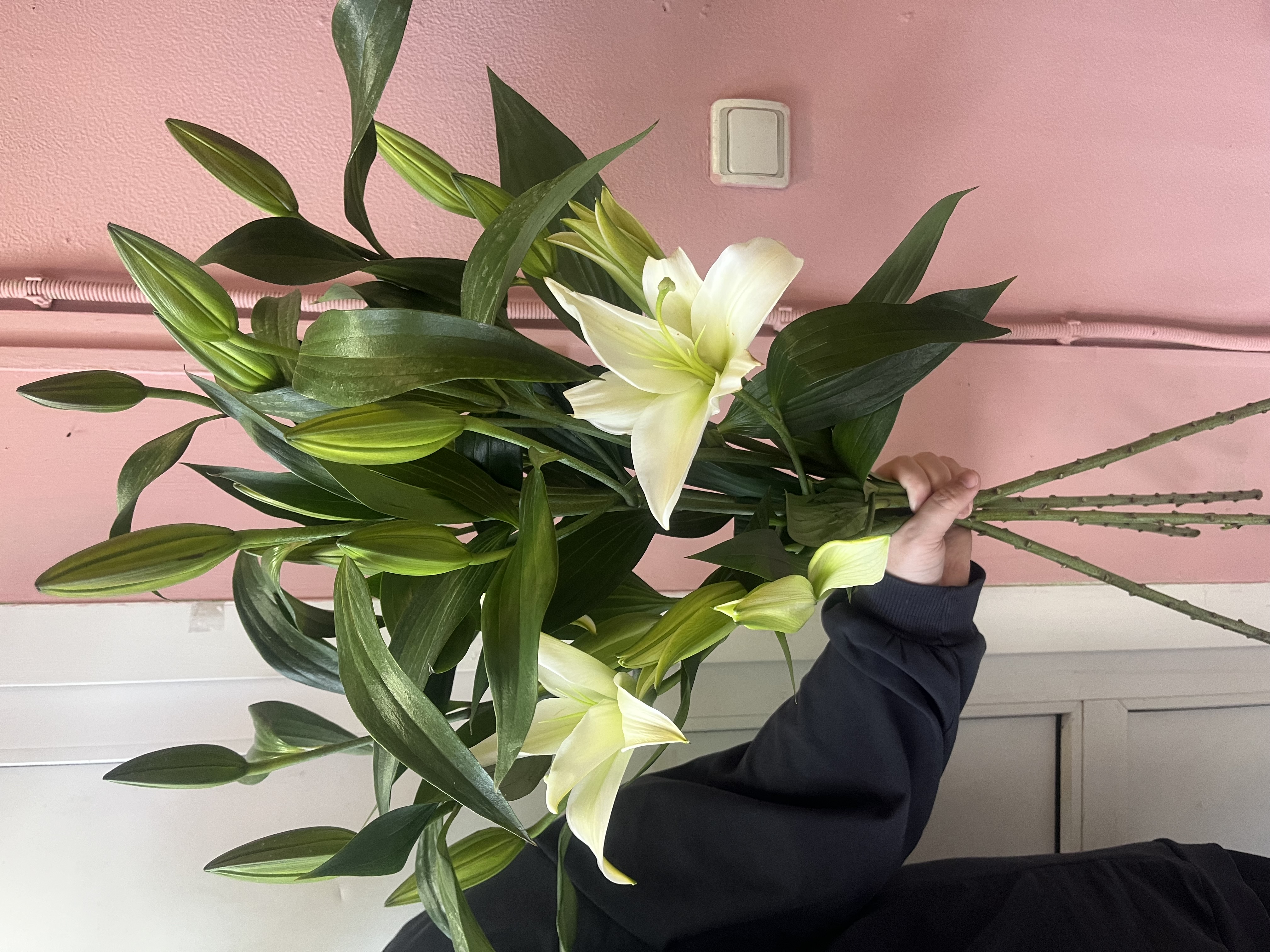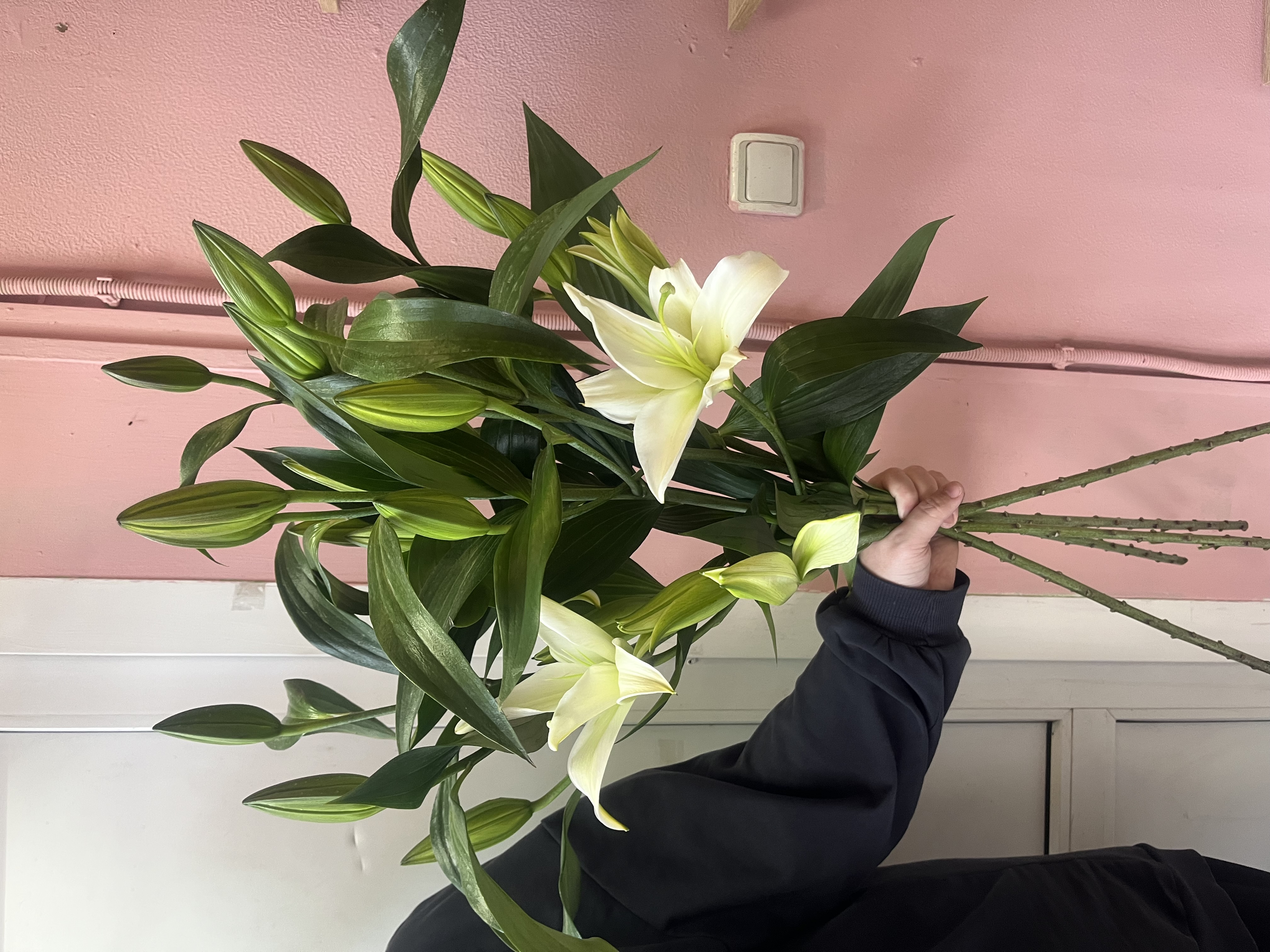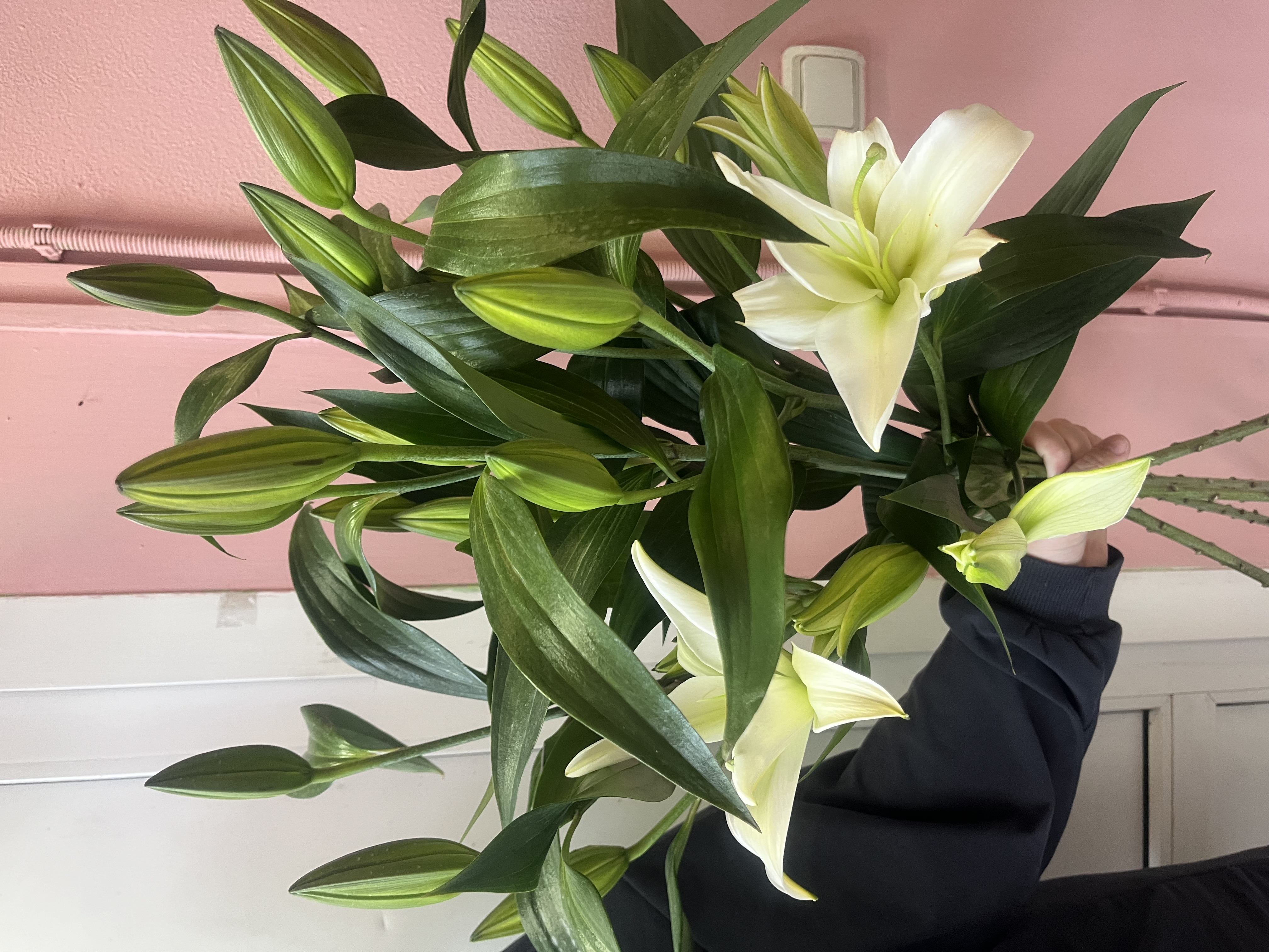 Элегантная композиция из белоснежных лилий с плотными нераскрывшимися бутонами. Длинные стебли и выразительная зелёная листва создают вертикальный, стройный силуэт.